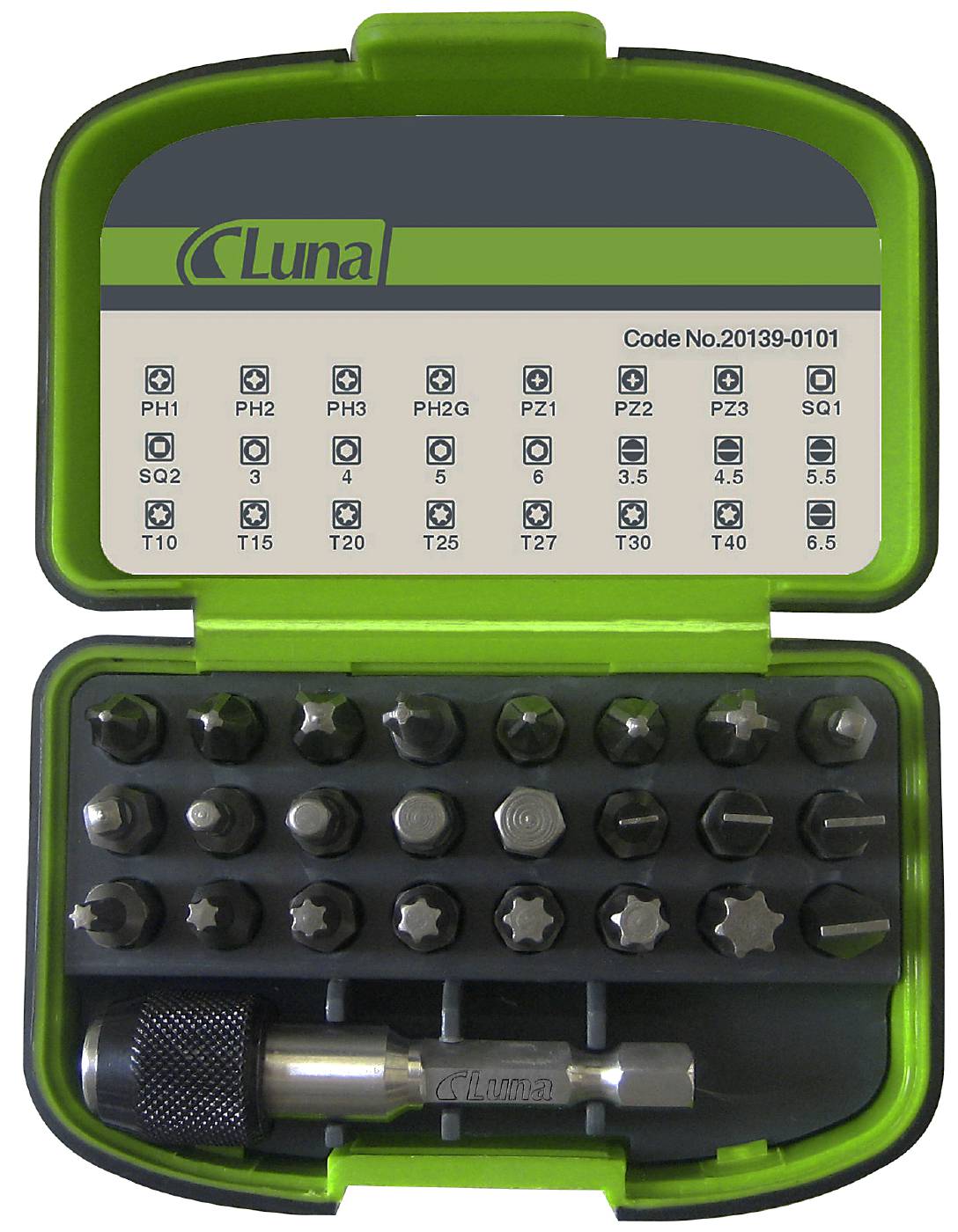 25 deler bitssett med hurtigchuckholder i praktisk oppbevaringsboks med belteklips. 1/4''-feste.