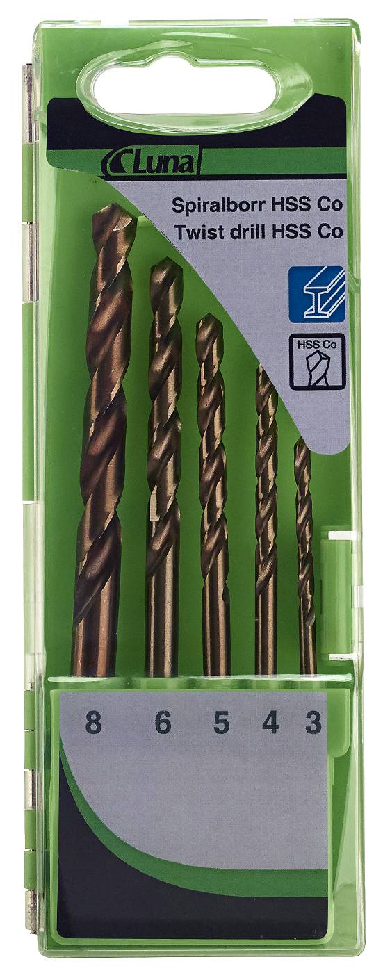 Spiralborsett i 5 deler legert HSS kobolt med stor slitasjemotstand for boring i vanskeligbearbeidende material f.eks. rust-, syre- og varmebestandig stål. Mål iflg. DIN 338.