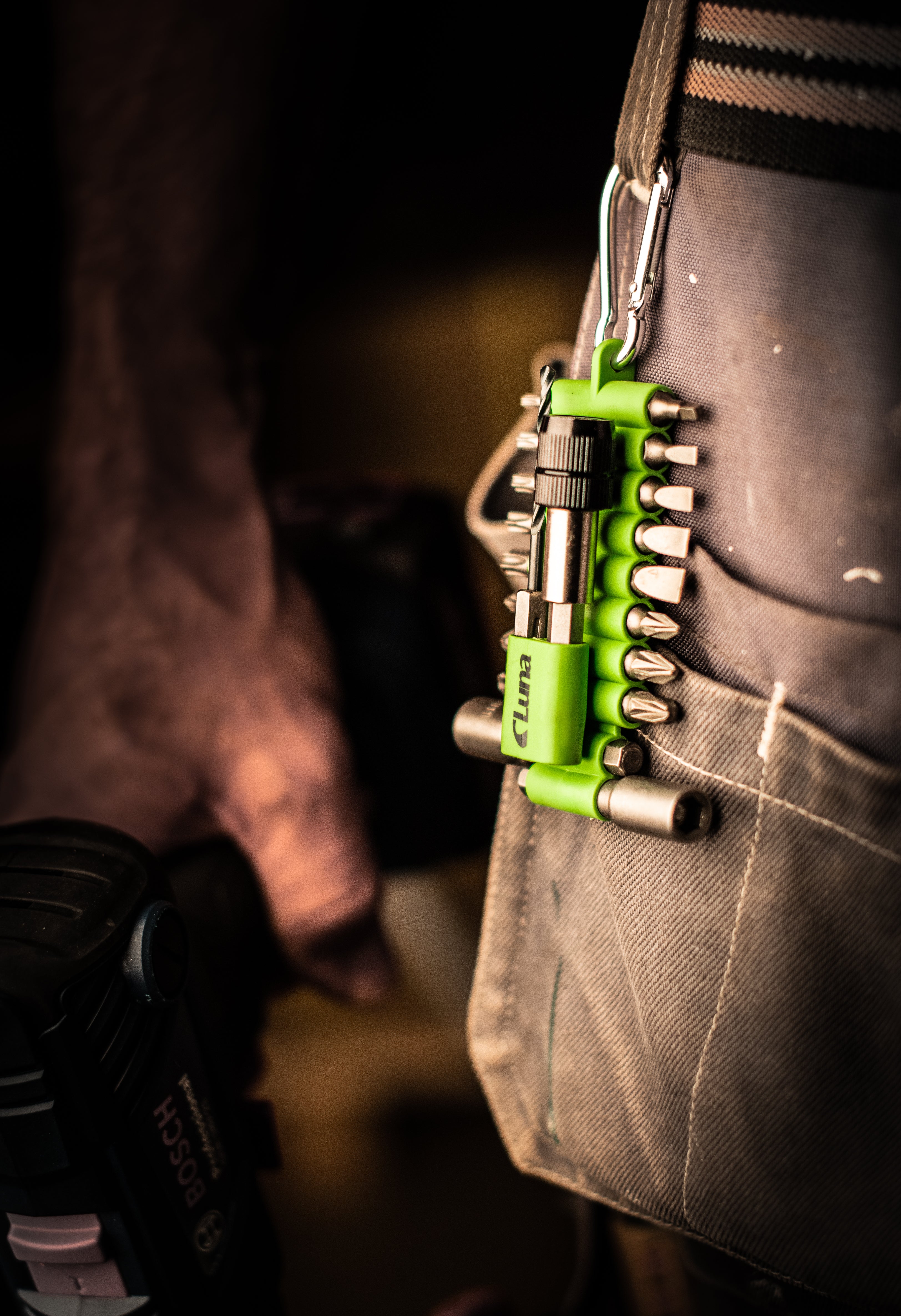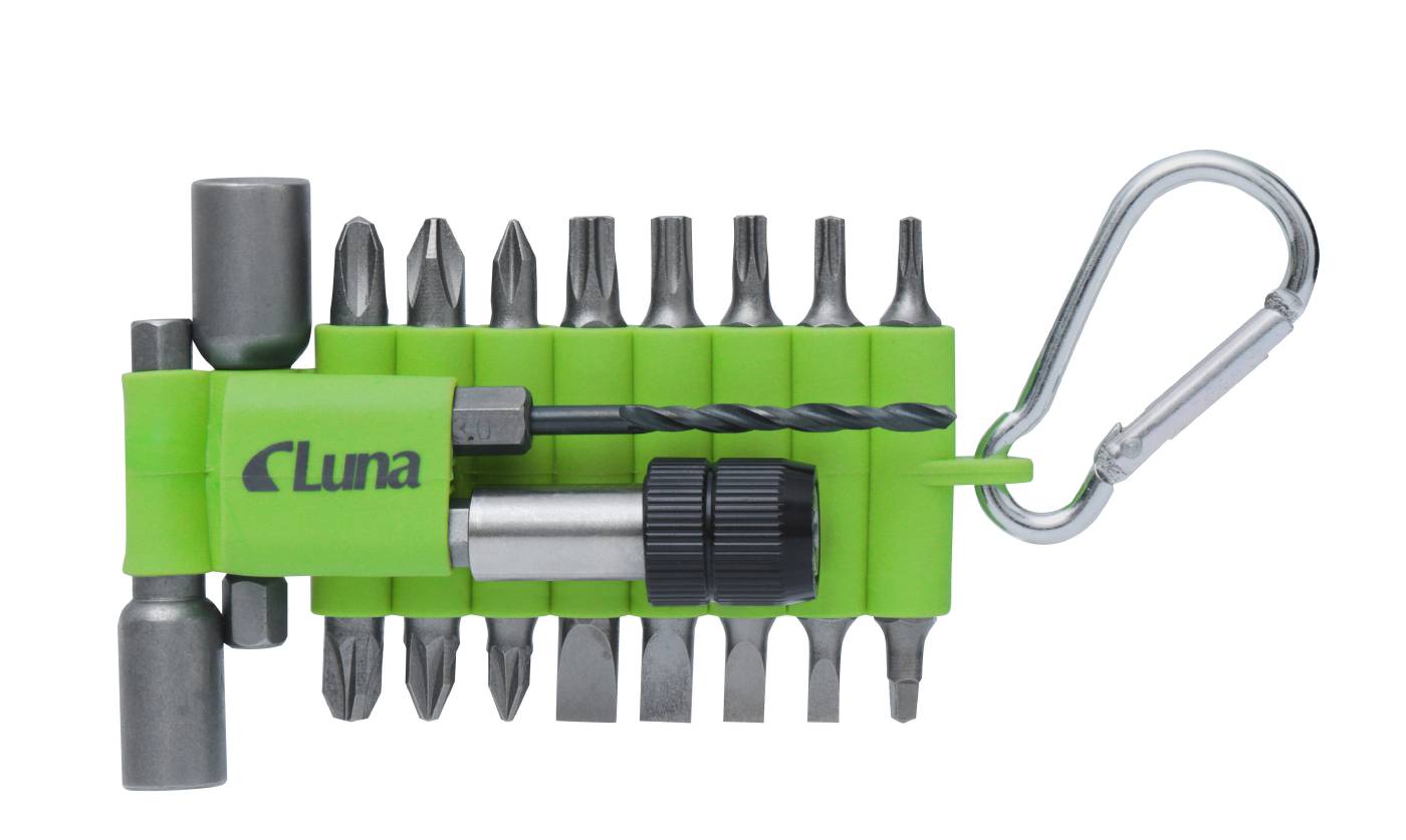 20 deler bitsklips med de vanligste bitsene. Smidig karabinkrok for enkel festing og enkelt å komme til.