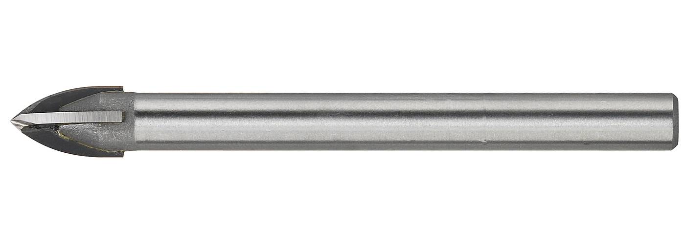Bor med fireskjærs hardmetallspiss. For boring i glass, speil, flasker, fliser, keramikk og porselen.