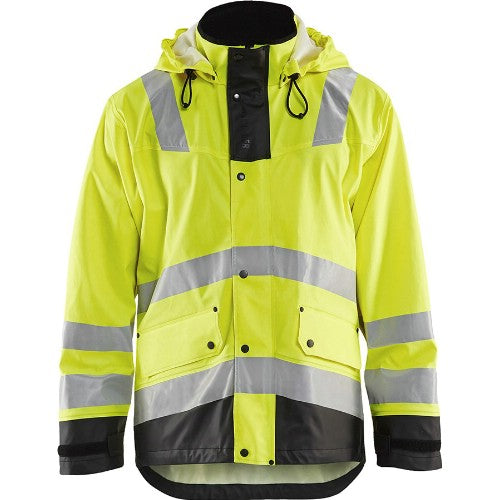 Vanntett, PU-belagte regnjakke med sveisede sømmer og innebygd ventilasjon. God ventilasjon i ryggen transporterer bort fuktighet. Avtakbar hette med snøring og mulighet for justering av størrelse med borrelås. Refleks over skuldrene.