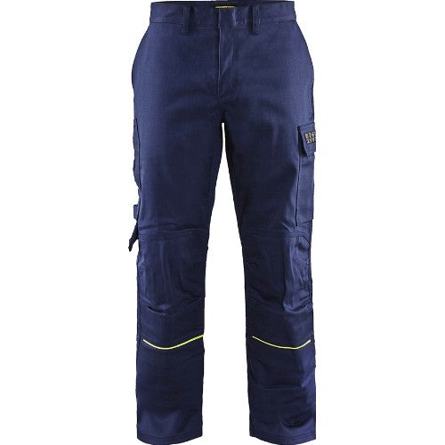 Midjebukse i kraftig, fleksibelt stoff. Flammehemmende, antistatisk og sertifisert for sveiseklasse 2. Sidelommer. Baklomme med klaff med skjult metall trykknapp. Benlomme med klaff. Tomstokklomme med knivholder. D-ring. Utvendige kneputelommer. Gylf med metallglidelås. Hemper. Utvendige etiketter. Reflekterende detaljer. Vaskes på 60°C.