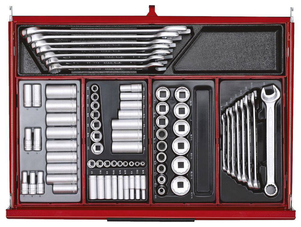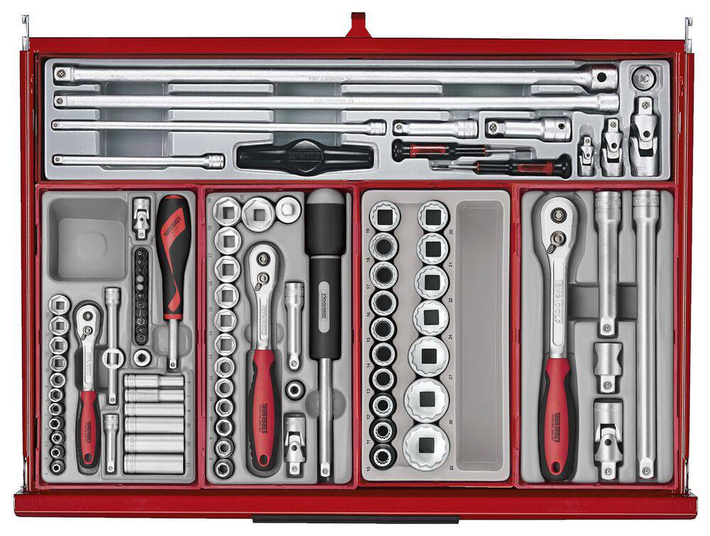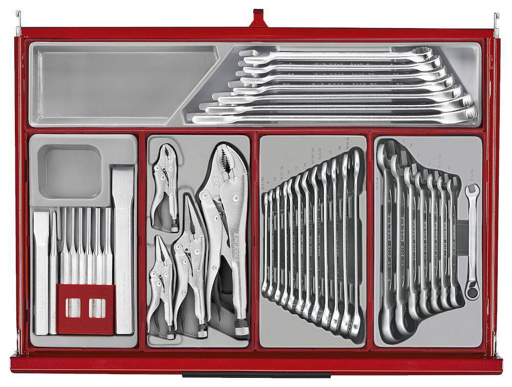 Verktøysett Teng Tools TKW53R615T er et verktøysett med 615 deler i en 53'' verktøyvogn PRO35™, med en arbeidsbenk av laminert MDF-plate (18 mm). Ni skuffer i ulike størrelser med 3-trinns kulelagrede skinner og matter av EVA-skum. Skrog av høykvalitativt stål (tre deler). Behandlet med fosfatfri rustbeskyttelse (5-trinnsbehandling) og pulverlakkert overflate. Har svært slitesterke og svingbare styrehjul (6''). Inneholder mange ulike verktøy for industribruk, organisert i spesialdesignede moduler som en del av Teng Tools Tool Control System.