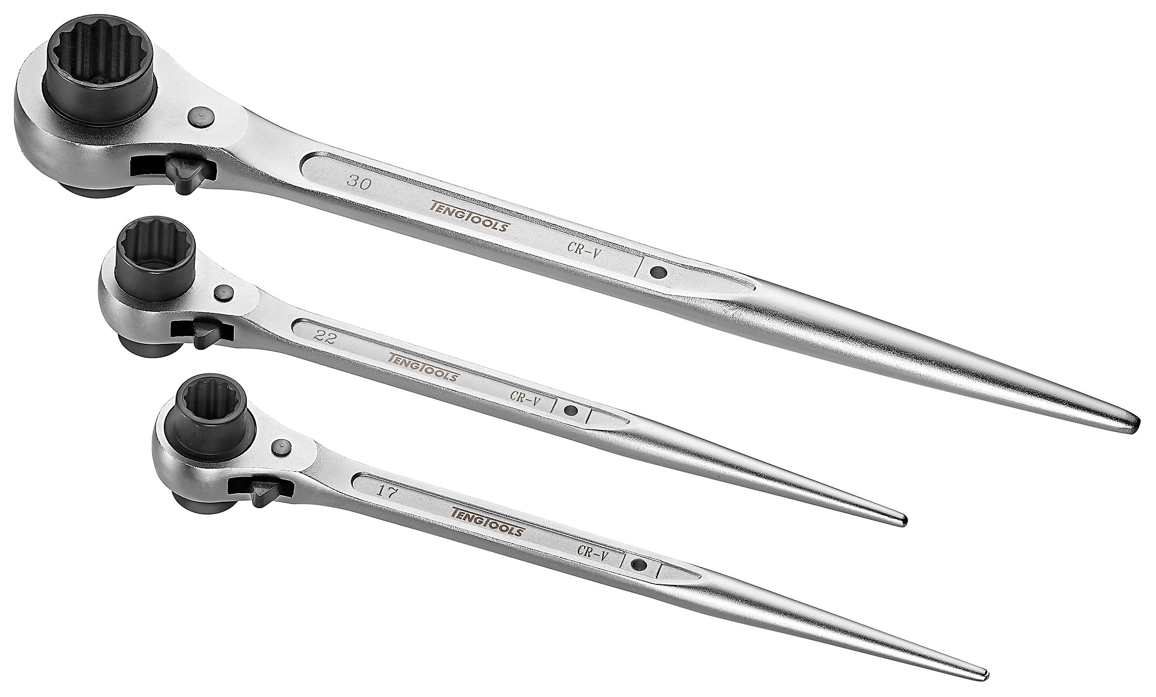 Skrallenøkler i kromvanadiumstål for arbeider med f.eks. byggstillaser. To størrelser i hver nøkkel, 12-kant ringskralle med 32 tenner.