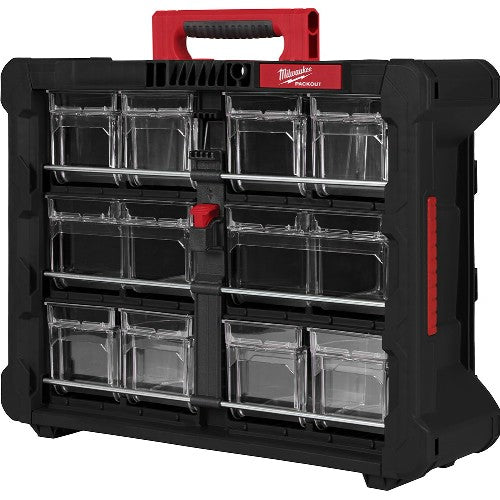 Tilbehørskoffert med 10 vippebokser, 8 små og 2 store transparente rom. Boksene kan tippes og tas helt ut. Passer til oppbevaring av mindre gjenstander som skruer, bits, spiker osv. Ergonomisk håndtak for komfortabelt grep og transport. Laget av slagfast materiale. Verktøykassen kan monteres på monteringsplate for veggmontering. Inngår i Milwaukees modulære oppbevaringssystem Packout.