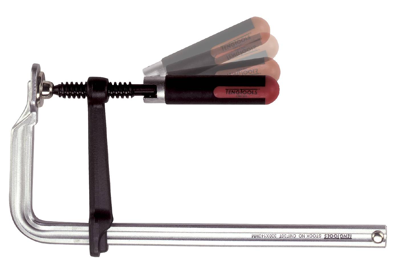 Profilert skinne. Trykkskive med kuleledd. Med fleksibelt tokomponentshåndtak for best mulig kraft ved tiltrekking og løsning.