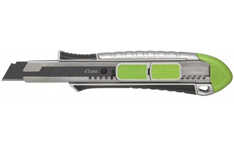Brytebladkniv, en svært robust kniv med hus av sinklegering og myke ergonomiske gummidetaljer for komfortabel bruk. Dobbel bladfunksjon. Den fremre knappen skyver frem bladet 15 mm og har automatisk returfjær. Perfekt for åpning av pakker eller andre raske skjærebehov. Den bakre knappen skyver frem bladet til ønsket utstikk. Det bakre plastlokket kan tas av og brukes som bryteverktøy for nytt blad. Leveres med SK2H-blad. Hull for verktøysikring.