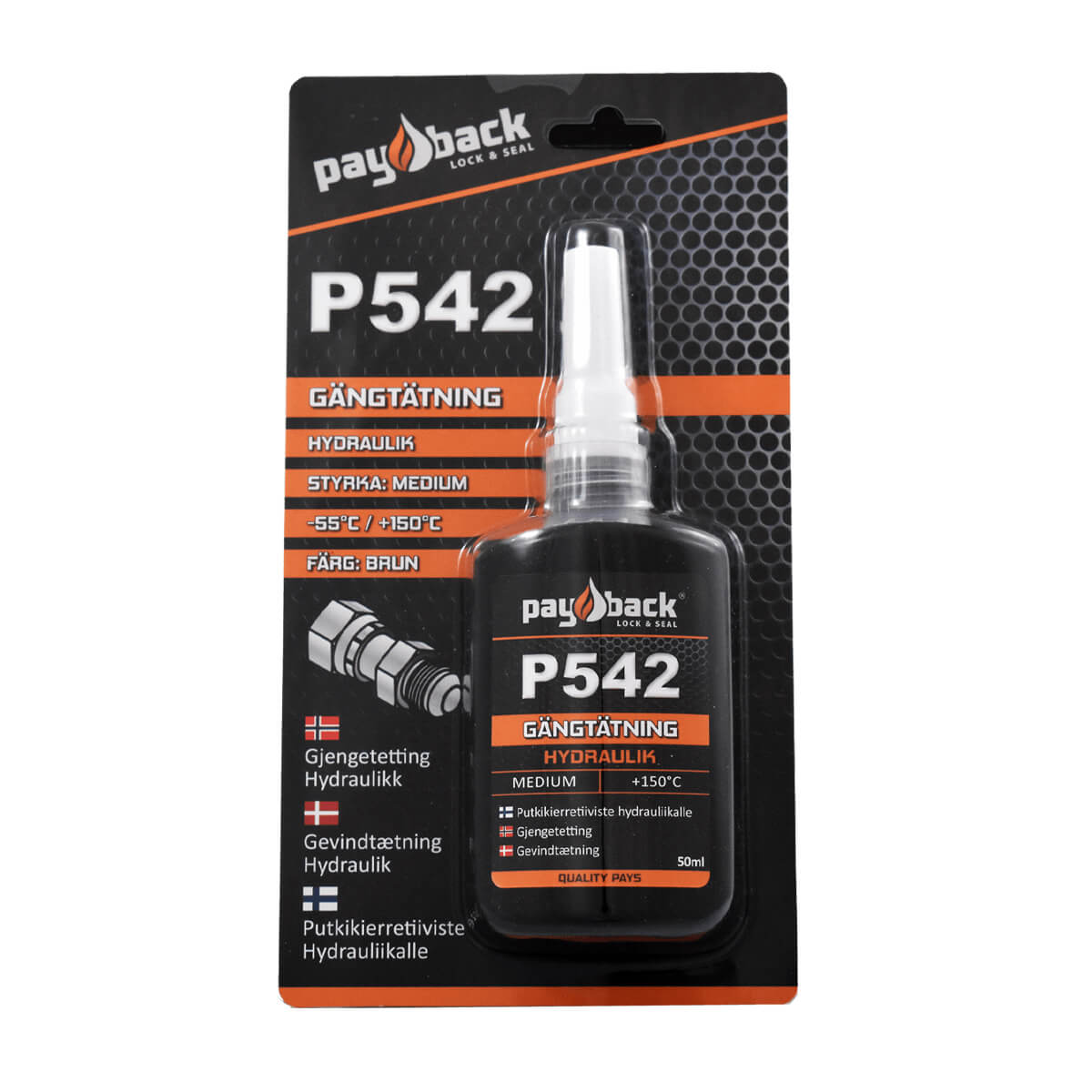 P542 er en hydraulisk gjengetetning og lås for metallforbindelser. Danner en vibrasjonssikker låsing og en tøff høytrykkstetning på alle typer gjengede koblinger som brukes på lav-, middels- og hytrykksledninger i f.eks. hydraulikksystem eller andre typer system.