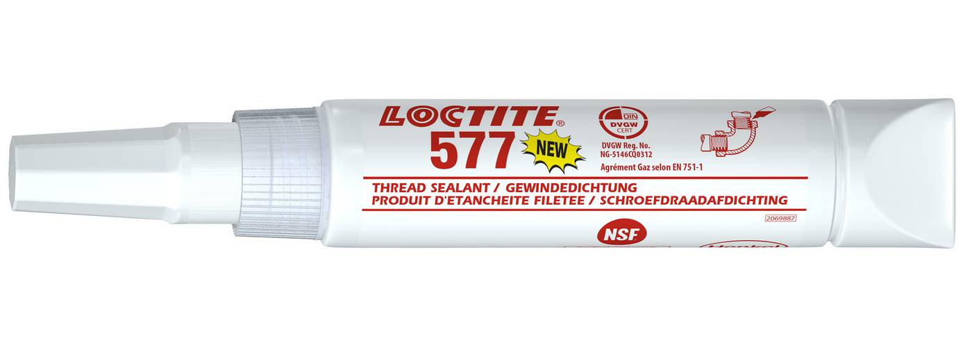 577 Gjengetetting. Anaerob. Utformet for fiksering og tetting av metallrør og rørkoblinger samt andre sylindriske metallmonteringer. Bare egnet til metallgjenger. Middels høy demonteringsstyrke. Produktet gir en umiddelbar lavtrykkstetting for rør og rørkoblinger. Hverken kryper, krymper eller forårsaker igjentetting av system ved ødeleggelse. Produktet har utmerket termisk og kjemisk motstandskraft og gir lavere grad av utflyting etter applisering av delen. Bestandig mot drivstoff, olje, kjølemidler og hydraulikkvæsker. Enkel å applisere. Næringsmiddelgodkjent i henhold til P1 NSF Reg. nr: 123001. DVGW-godkjenning (EN 751-1): NG-5146CQ0312. Farge: gul. Maks. gjengestørrelse: M80/R3ʺ. Arbeidstemperaturintervall: -55 °C til +180°C. Løsningsmoment: 11 Nm. Tiksotropi: ja. Fluorescens: ja. Viskositet: 70 000 - 130 000 mPas. Kjemisk base: metakrylat.