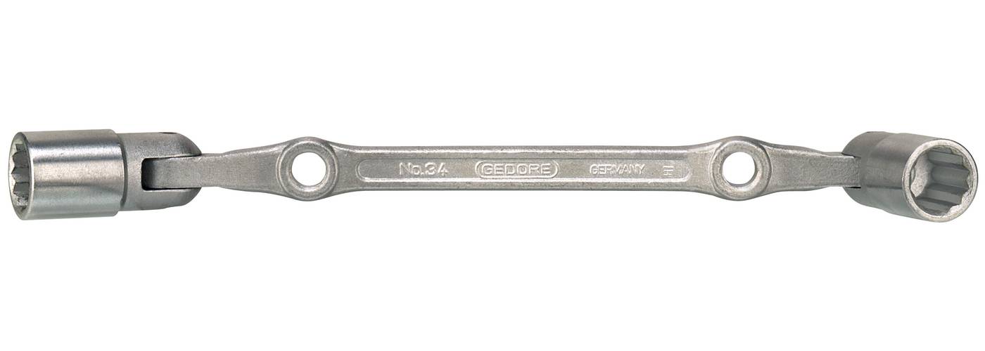 34. Av kromvanadiumstål. Doble, med tolvkant, tynnveggede innbyrdes ulike gripeåpninger. Ekstra stor leddbarhet. Forkrommet. Polerte hoder, med hull for dreiestift.
