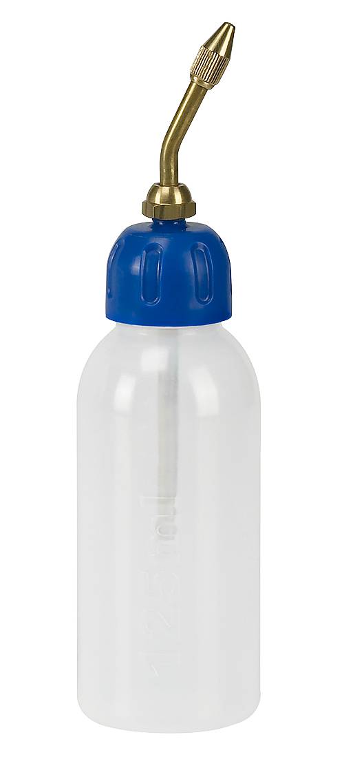 Av elastisk, transparent polyetylen. Syrefaste og uknuselige. Med tut av messing som kan skyves inn i beholderen, olje- og bensinbestandig tettet. (Ikke for tynner).