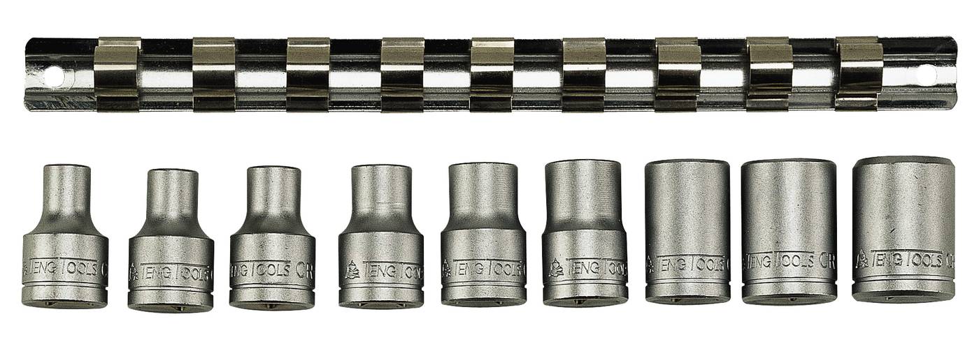 Sett med 9 TX-piper for utvendige spor i henhold til Torx-systemet. Montert på klips-holdere med pipe-klips. Mattkrom.