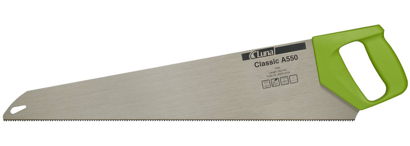 Modell Classic. Universaltannet. Tannspissherdet. Lakkert sagblad. Enkomponents håndtak - utformet som vinkelanlegg med 90° og 45° mot sagbladets rygg. Sagen har en skrå spiss for bedre gjennomgang midt i materialet.