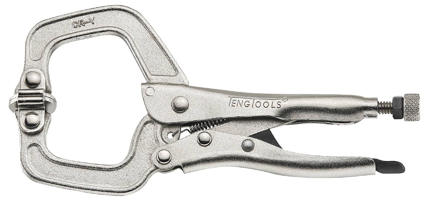 Sveisetang med c-formede kjefter for profiler etc. Selvlåsende med klemfri, enhånds- utløserarm og låsemutter på justeringsknappen. Med leddbare spennplater. Forniklet.