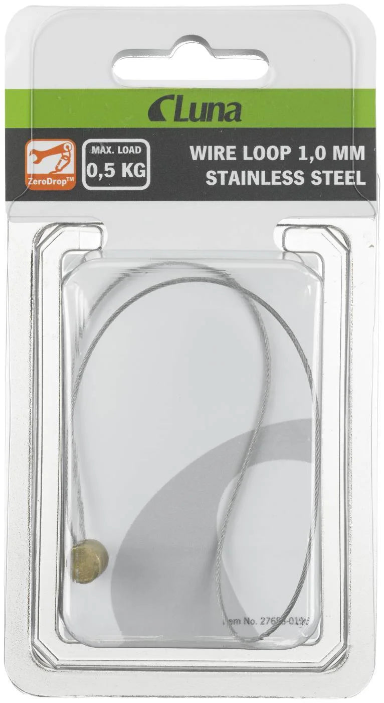 Wireløkke av rustfritt stål (AISI 304) med tynn plastbeskyttelse, for verktøysikring. Artikkel 276830106 og 276830205 har messingsplombe diam 8 mm og L= 6 mm, og artikkel 276830304 har messingsplombe diam 8 mm og L= 7 mm.