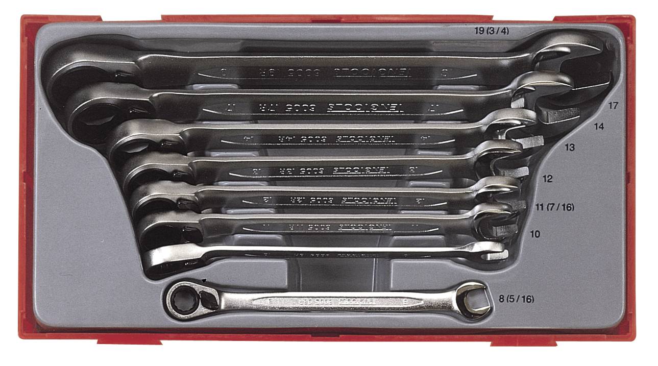 Sett med 8 nøkler. Av kromvanadiumstål. Kombinert fastnøkkel og tolvkant ringskrallenøkkel. Skrallefunksjon omstillbar for høyre- eller venstretrekking. Samme nøkkelvidde i begge ender.