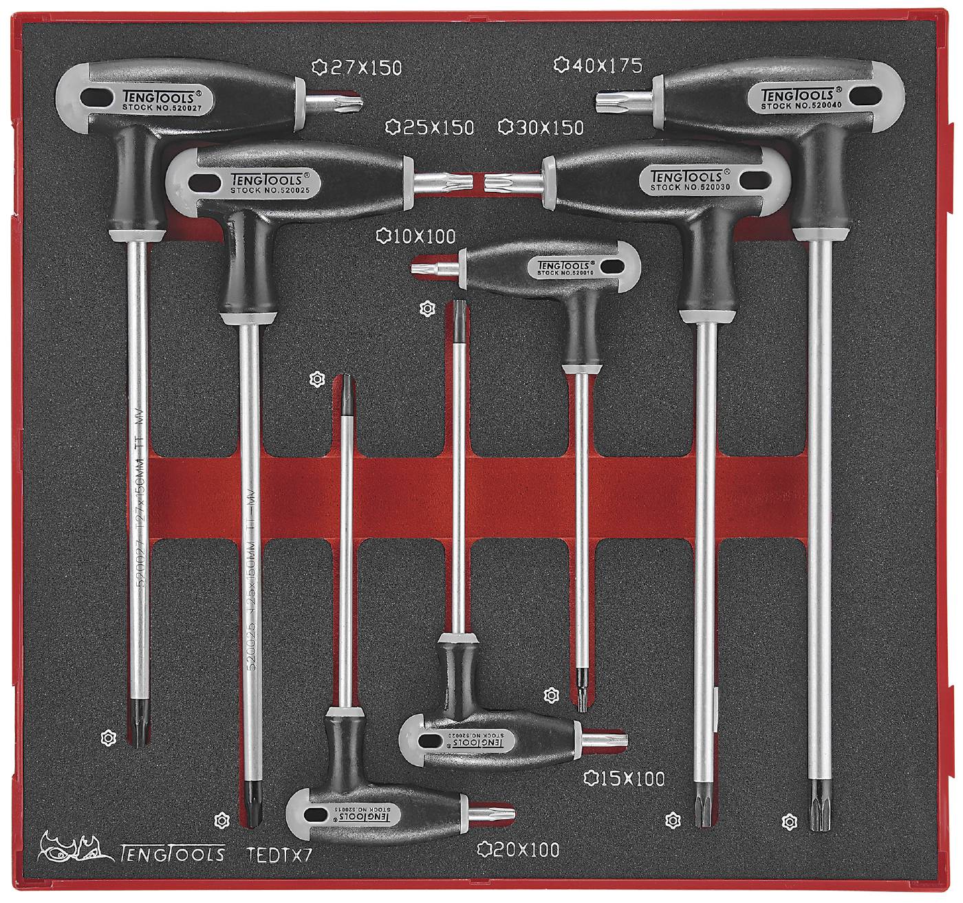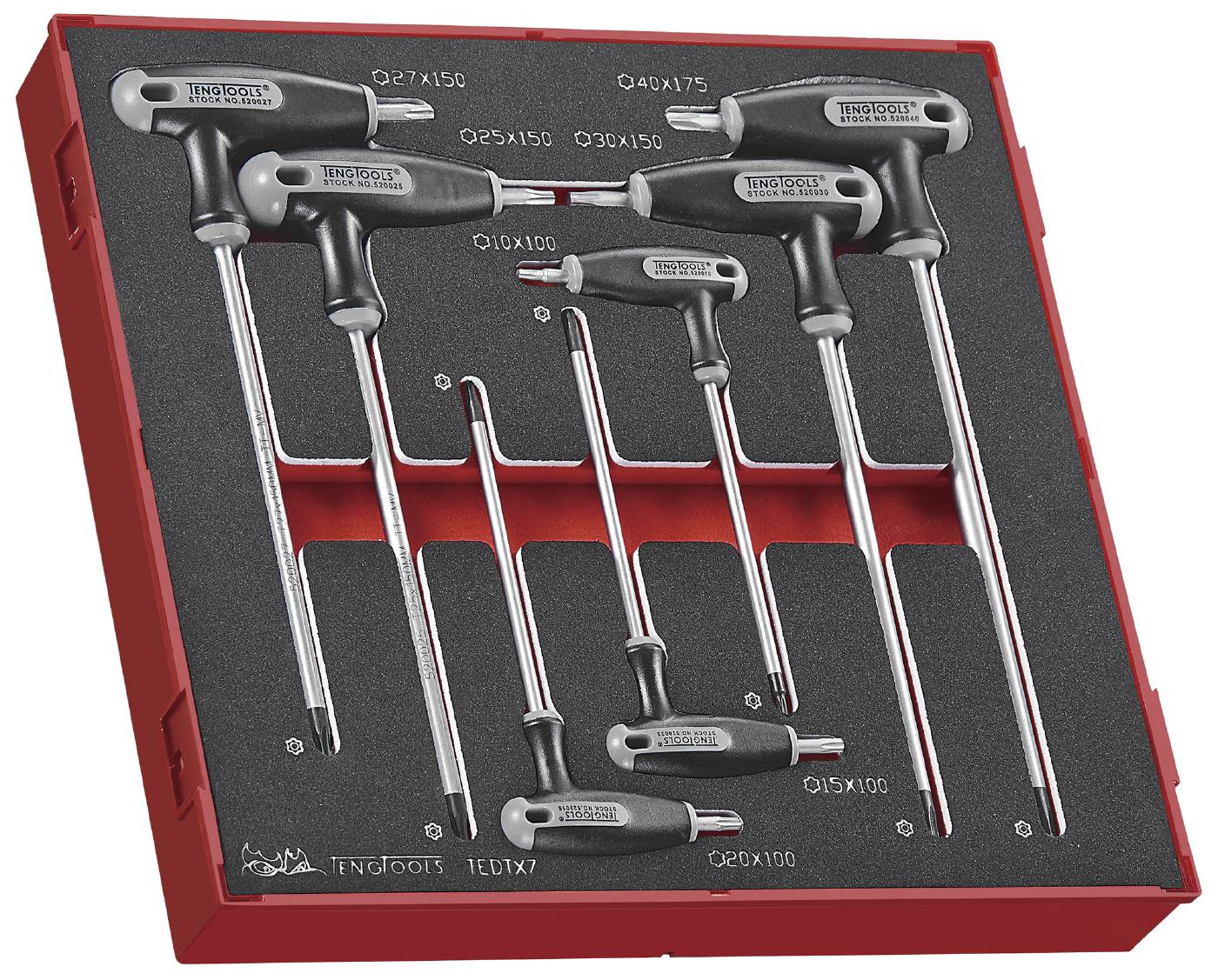 7 deler sett med TX-nøkler med T-håndtak. For innvendige spor i henhold til TX-systemet (den lange nøkkelenden også for skruer med senterspiss).