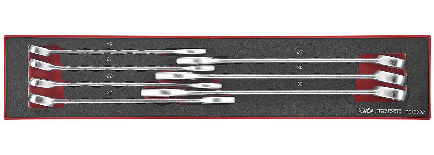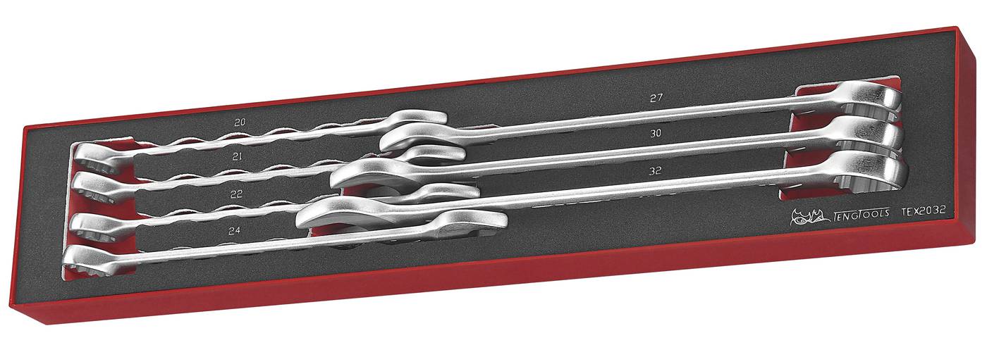 Leveres i innbyggingsboks av plast. Nøklene ligger i EVA-skum i tre ulik fargede lag. Boksene passer i Teng Tools verktøykasser og -vogner.