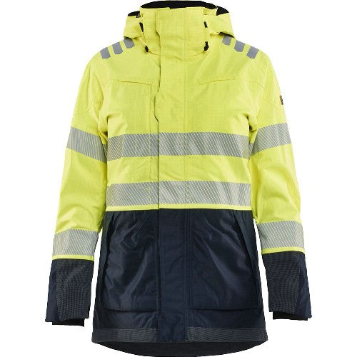 Fôret skalljakke i damemodell, laget i et vind- og vanntett, olje- og smussavvisende materiale med tapede sømmer og pustefunksjon. Multinorm, antistatisk og med innebygd flammebeskyttelse (flammehemmingen er integrert i fibrene). Metall- og polyesterfri. Brystlomme med glidelås og D-ring. Napoleonlomme på innsiden av frontslåen. Innerlomme. Sidelommer med fleecefôr og glidelås. Avtakbar ID-kortlomme for flammebeskyttede plagg som festes i D-ring. Utvendige sertifiseringsetiketter. Avtakbar, justerbar hette tilpasset hjelm og hørselvern. Fleecefôret, høy krage. Frontlukking med skjult, kraftig toveis plastglidelås og frontslå med skjulte plasttrykknapper. Hemper på brystet for feste av teknisk utstyr som mikrofoner, gassdetektorer eller oksygenmålere. Justerbare ermeavslutninger med borrelås og innvendig mansjett. Forlenget rygg, justerbar nederkant med snor. Segmenterte, flammebeskyttede transferreflekser. Vannsøyle 16 000 mm, pusteevne Ret 12,6. Vaskes på 60°C.