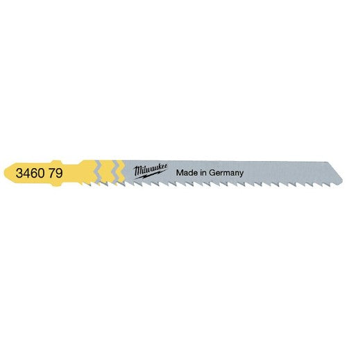Stikksagblad av kullstål med reversert tanning. Bladet kapper ved nedbevegelse og ikke motsatt som med tradisjonelle blad. Tilpasset for å gi splintfrie snitt i benkeplater og sponplater. For beste resultat uten pendelfunksjon.